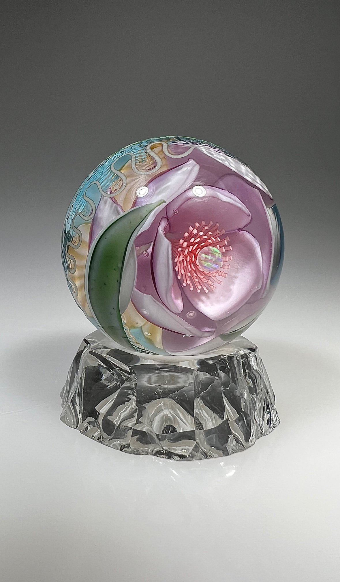 Soft pink Bloom with an opal and orange burst pistil center, mirrored with aqua bloom and surrounded in water texture and leaves. It is 1.4"/35.55 mm and comes with a custom knapped ice stand. Material: Borosilicate glass