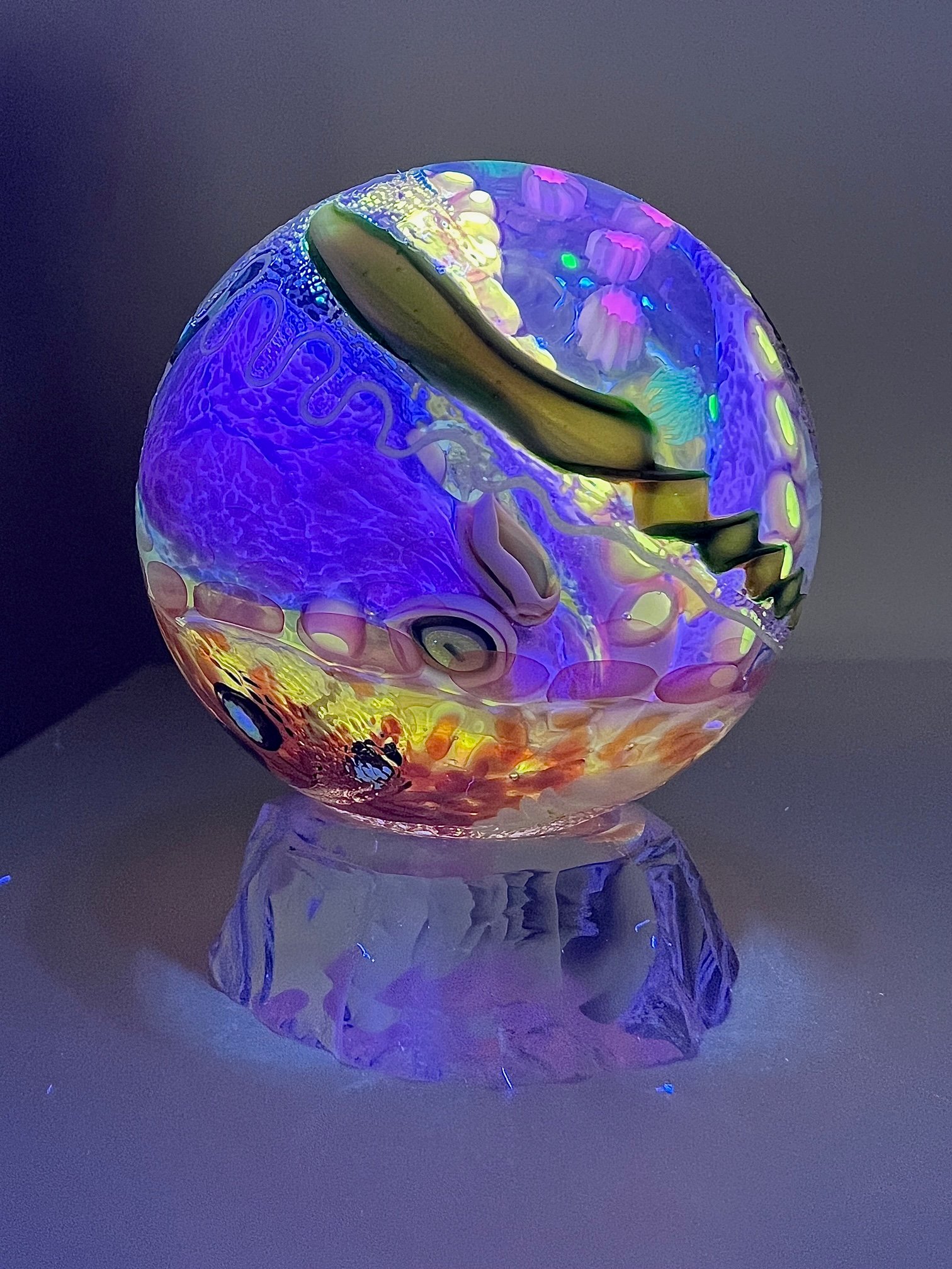 Bioluminescent Tidepool Marble with Octopus, Seastar, Sea Anemones, Kelp and surrounded with cold-worked water texture. It is 2.2"/55.89mm, made with UV glass and comes with a custom knapped ice stand.